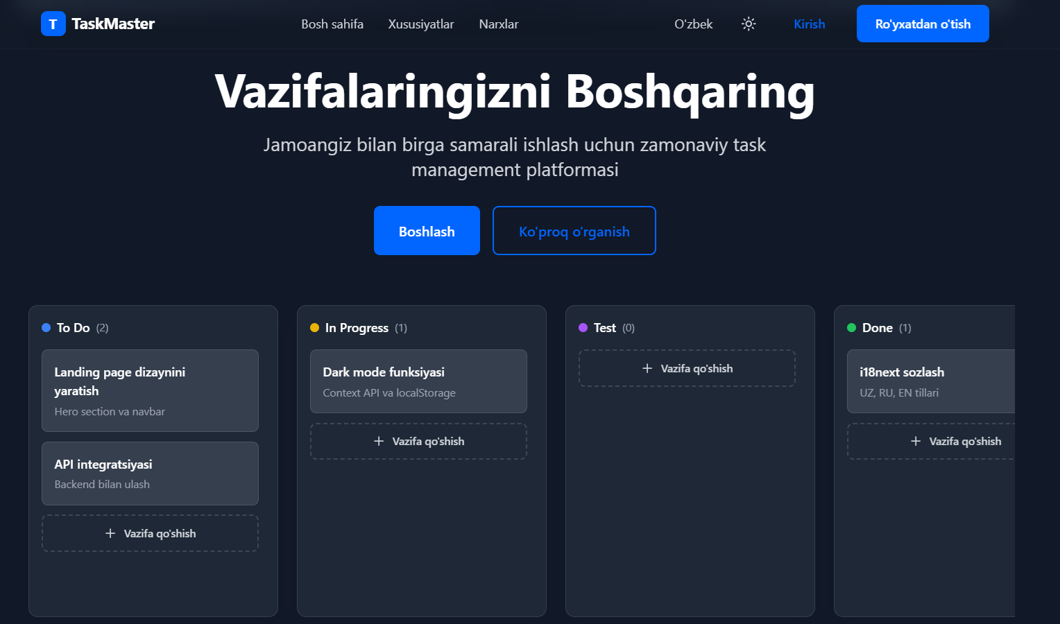 Zamonaviy stack va best practice'lardan foydalanamiz.